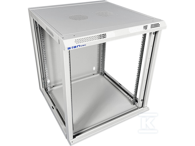 Шафа настінна 19" 12U 600x500, цілісна, МЕТАЛЕВІ двері одностулкові, задня стінка суцільна, бічні панелі рухомі перфоровані, колір сірий, 4 балки, FLAT PACK ALANTEC SW-12U-600-500-N-DMJ-OP-RP-B-S