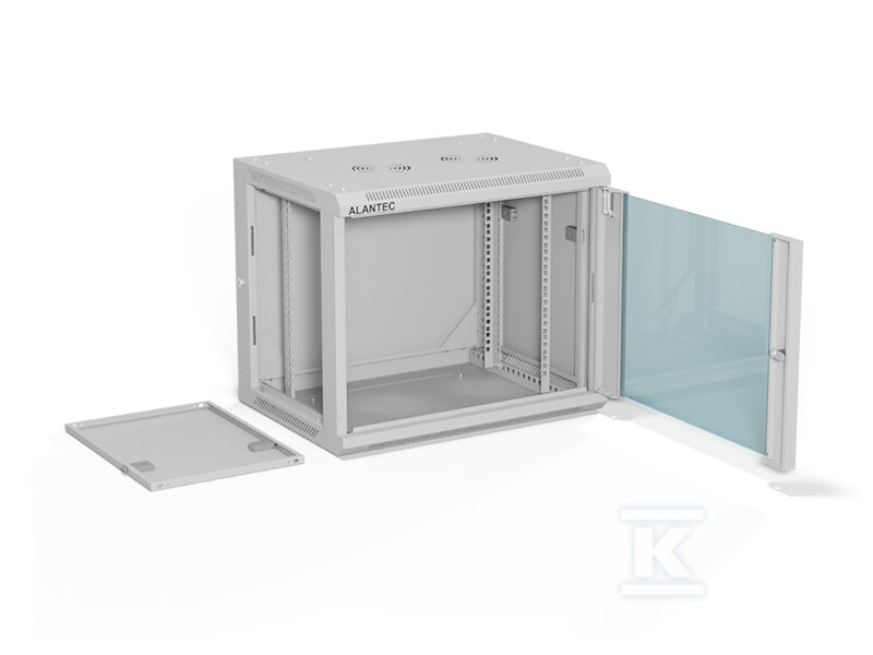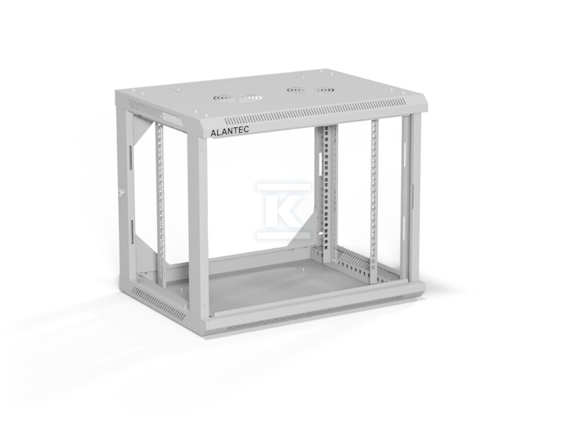 Шафа настінна 19" 9U 600x450, (опція двосекційна) двері скляні одностулкові, тил кришка повна демонтажна, бічні панелі повні демонтажні з ключем, 4 балки, колір сірий, ALANTEC SW-9U-600-450-01-SA