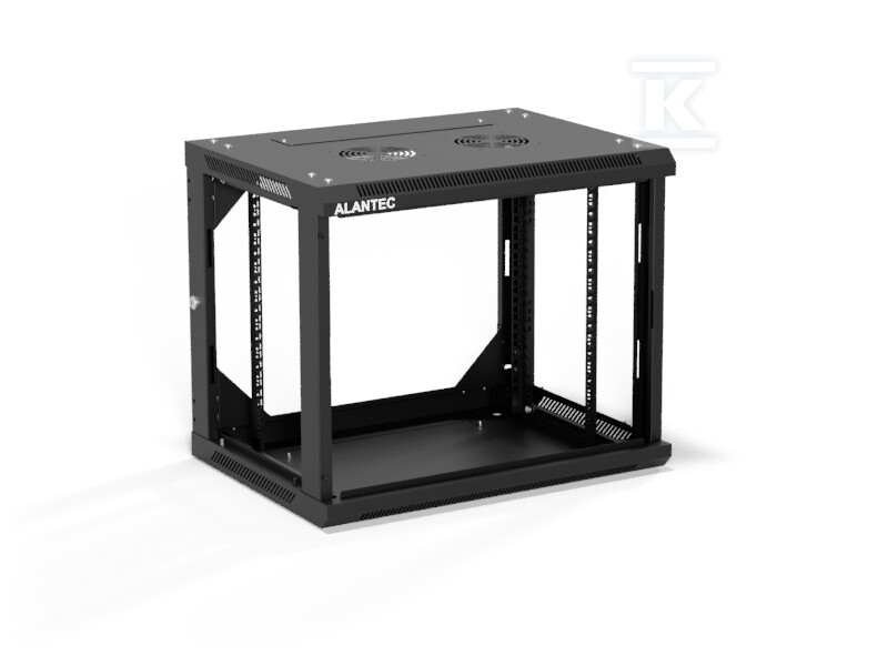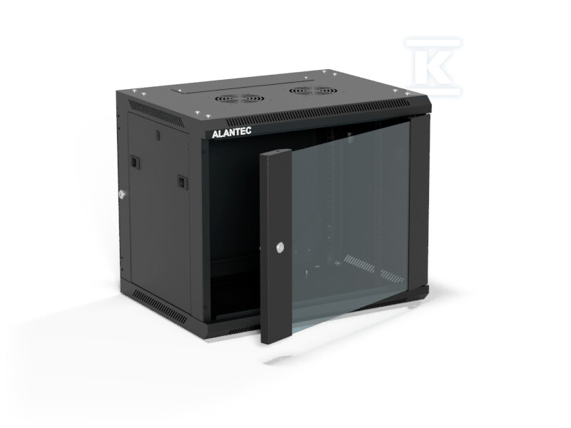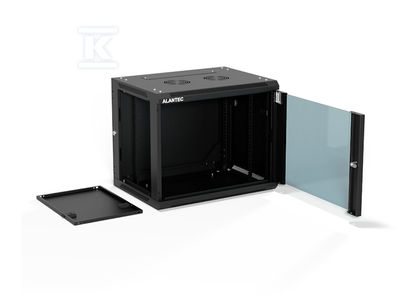 Шафа настінна 19" 9U 600x450, (опція двосекційна) двері скляні одностулкові, задня кришка повна демонтажна, бічні панелі повні демонтажні з ключем, 4 балки, колір чорний, ALANTEC SW-9U-600-450-01-CA
