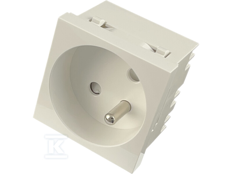 Це електричне гніздо 2P+Z, розміром 45x45 мм, призначене для побудови модульних електричних інсталяцій. Воно дозволяє гнучко організовувати точки підключення в стандартній конструкції 45x45 мм. Завдяки можливості з'єднання зі спеціальними з'єднувачами, дозволяє легко створювати багатократні гнізда, що особливо корисно в місцях, які потребують великої кількості точок живлення.