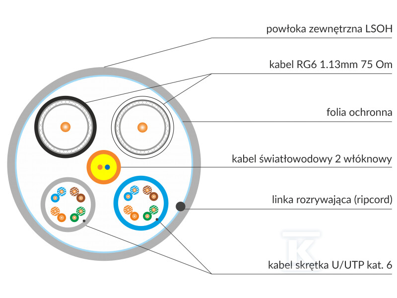 Кабель містить два провідники U/UTP кат.6 для передачі даних, два провідники RG6 з жилою 1.13 для телебачення та два оптоволокна FTTH 2J, що дозволяє створити повну мультимедійну інфраструктуру. Різні кольори оболонок окремих провідників полегшують ідентифікацію під час встановлення, а додаткова захисна фольга та розривний шнур (ripcord) значно спрощують процес зняття зовнішньої оболонки.