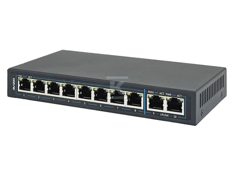 Некерований комутатор (switch) 10xRJ45 - 8 портів RJ45 PoE+ 100Mb/s + 2 порти RJ45 Uplink 1Gb/s (бюджет потужності 96W) AVIZIO AV-SU8MP2G
