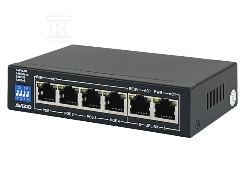 Некерований комутатор (switch) 6xRJ45 - 4 порти RJ45 PoE+ 1Gb/s + 2 порти RJ45 Uplink 1Gb/s (бюджет потужності 60W) AVIZIO AV-SU4GP2G