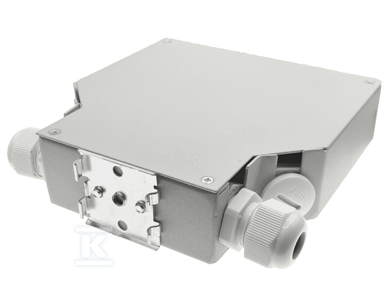 Корпус, виготовлений з порошково-фарбованої сталевої бляхи, гарантує довговічність та стійкість до механічних пошкоджень. Сірий колір корпусу полегшує інтеграцію з навколишнім середовищем. Дві кабельні ввідні муфти PG11 дозволяють організовано вводити кабелі в кросову панель, а інтегрований лоток для зварювання забезпечує місце для оптоволоконних з'єднань. Це рішення особливо корисне при будівництві нових мереж або модернізації існуючих.