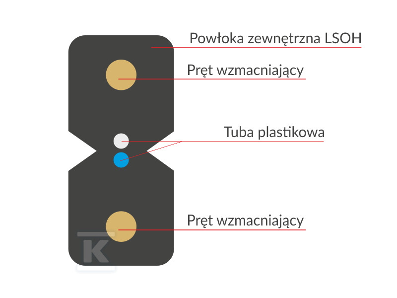Кабель характеризується посиленням сталевими прутами, які забезпечують стабільність та стійкість до механічних пошкоджень. Оптоволоконні волокна G.657.A1 гарантують мінімальний радіус вигину, що особливо важливо в тісних просторах. Оболонка LSOH (Low Smoke Zero Halogen) забезпечує безпеку використання шляхом обмеження викидів токсичних речовин у разі пожежі та є стійкою до дії ультрафіолетового випромінювання. Завдяки цьому кабель справляється з різноманітними застосуваннями – від телекомунікаційних мереж, через локальні мережі LAN, до встановлень у житлових будинках та офісах.