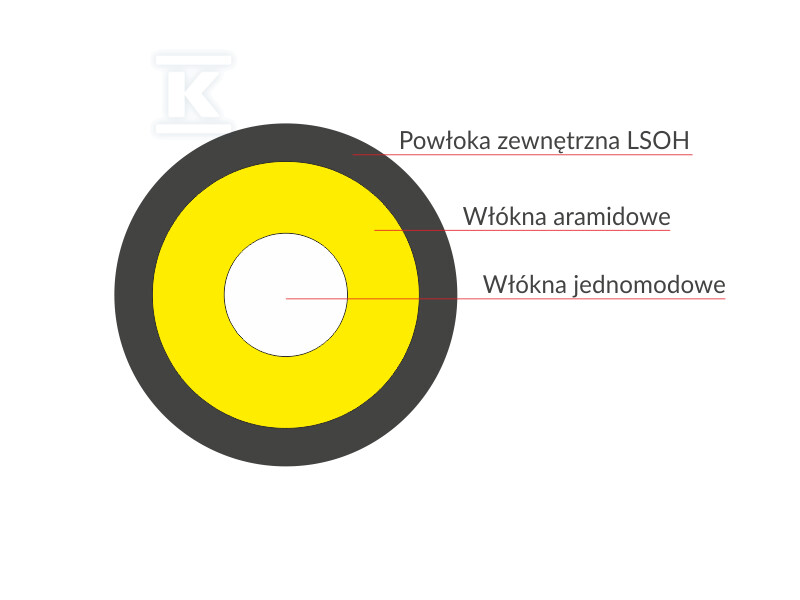 Кабель характеризується круглою конструкцією, посиленою арамідними волокнами, що робить його самонесучим і стійким до розтягування. Легка конструкція з діаметром 3 мм полегшує прокладання кабелю в різних умовах – як усередині будівель, так і назовні. Використані волокна G.657.A забезпечують велику гнучкість і мінімальний радіус вигину, що особливо важливо під час встановлення в тісних просторах. Оболонка LSOH (Low Smoke Zero Halogen) забезпечує пожежну безпеку шляхом обмеження викидів токсичних газів під час горіння та є стійкою до дії ультрафіолетового випромінювання, що збільшує довговічність кабелю в зовнішніх умовах. Повністю діелектрична конструкція усуває ризик електромагнітних перешкод.