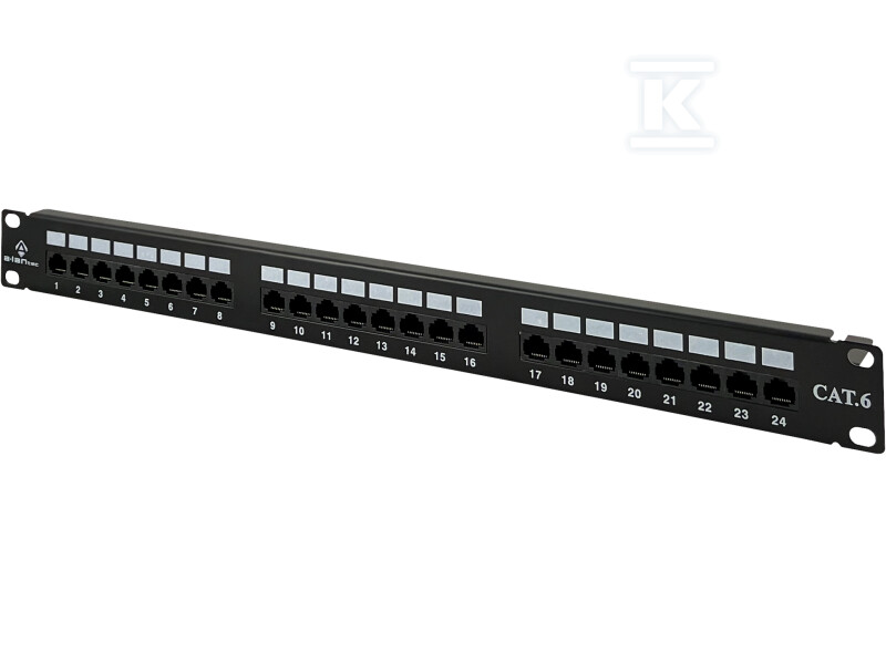 Патч-панель монтується в стандартну шафу 19" заввишки 1U, дозволяє впорядковано завершити кабелі інсталяційні та з'єднати їх з активними пристроями. Обладнаний 24 портами RJ45 з універсальними з'єднувачами LSA, що дає змогу гнучко конфігурувати з'єднання відповідно до стандартів 568A/B. Компенсаційний пристрій, реалізований на друкованій платі, мінімізує перешкоди та забезпечує оптимальну якість передачі. Це рішення особливо корисне в офісах, серверних та інших місцях, де важлива надійність та легкість обслуговування мережі.