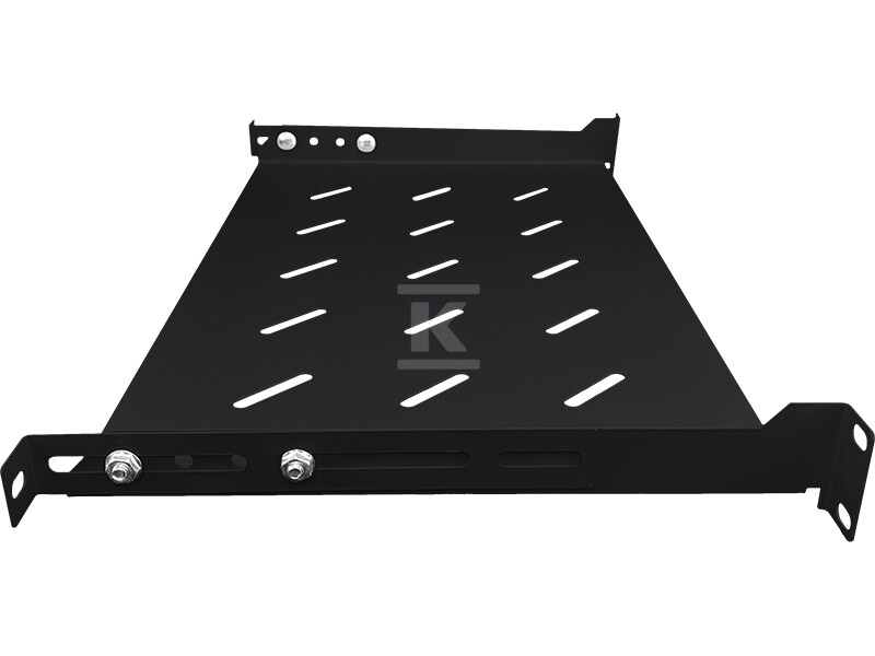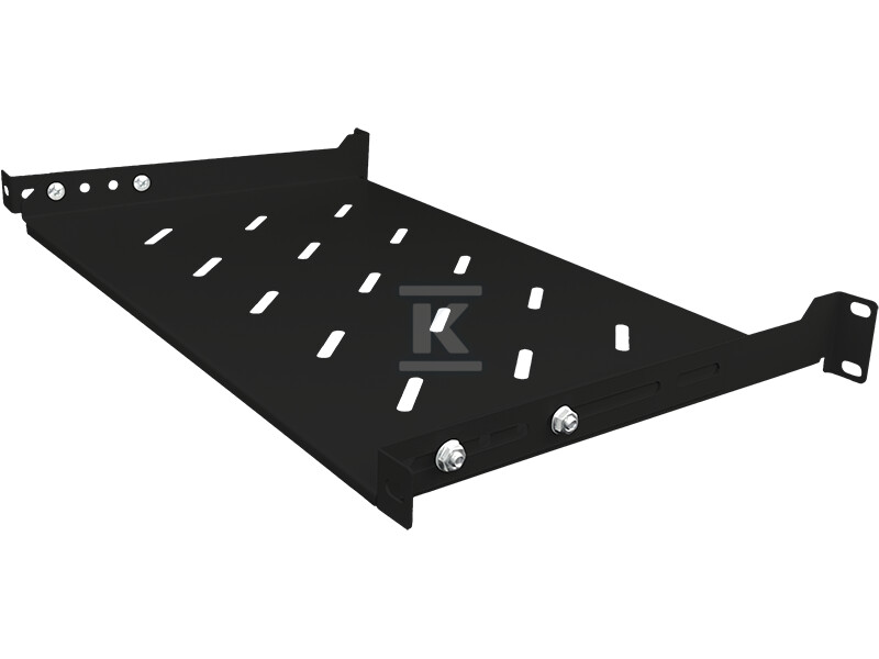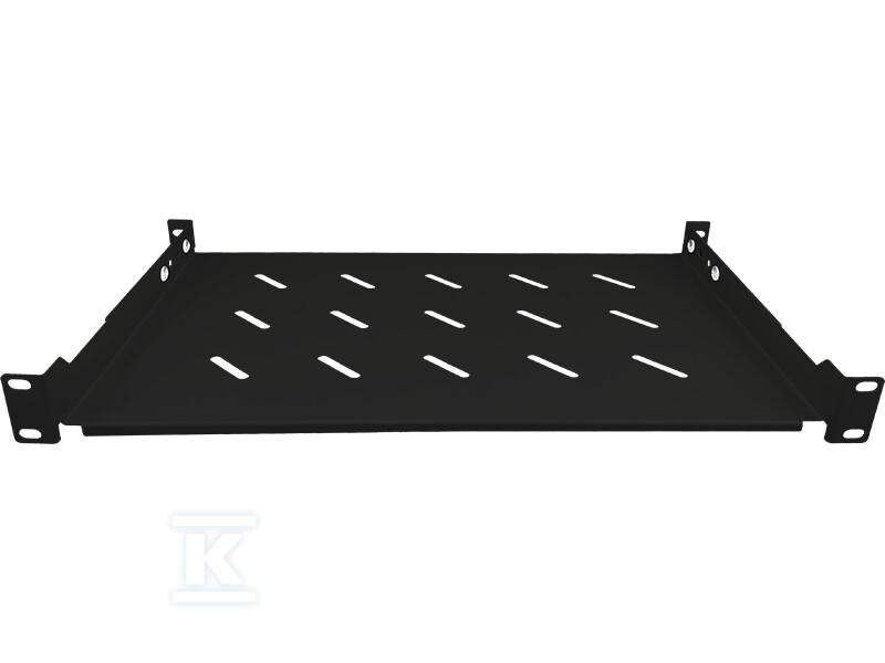 Виготовлена з міцного сталевого листа та порошково пофарбована в чорний колір, гарантує довговічність та стійкість до корозії. Перфорована конструкція забезпечує належну вентиляцію встановлених пристроїв, що є ключовим для їх надійної роботи. Чотири точки кріплення дають впевненість стабільного встановлення полиці в шафі rack.