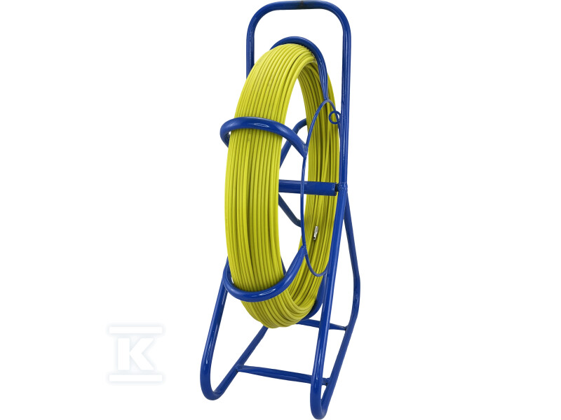 Пілот характеризується високою пружністю та стійкістю до згинання та розриву. Волокно скла FRP розміщено на металевому стенді з функцією намотування, що полегшує зберігання та транспортування. Додатковий шар жовтого пластику PE не тільки захищає волокно, але й забезпечує кращий ковзання під час протягування кабелів, мінімізуючи тертя та полегшуючи роботу. Довжина 50 метрів дозволяє проводити роботи на більших відстанях без необхідності повторного намотування.