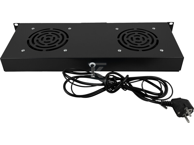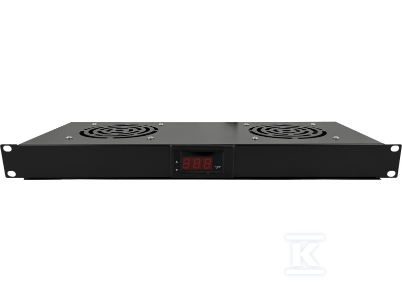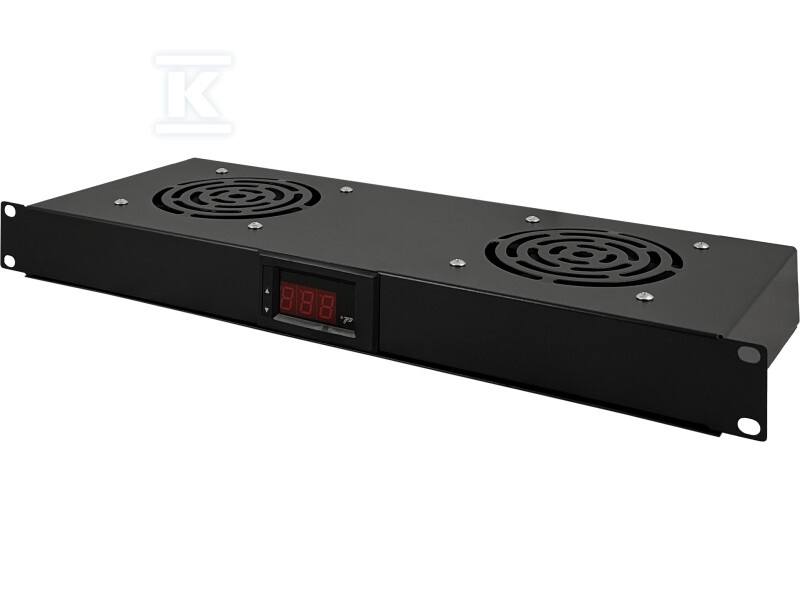 Два вентилятори забезпечують ефективне охолодження компонентів, а цифровий термостат дозволяє прецизійно контролювати температуру всередині шафи. Гнучке розміщення датчика температури є можливим завдяки кабелю довжиною 1.5 м. Панель дозволяє програмувати порогові значення температури та калібрувати датчик для точніших вимірювань. У комплекті знаходиться кабель живлення CEE 7/7, що полегшує підключення до живлення. Міцна конструкція гарантує довговічність пристрою, а монтаж у стандартній шафі 19" є простим та інтуїтивним. Чорний колір забезпечує естетичний вигляд панелі.