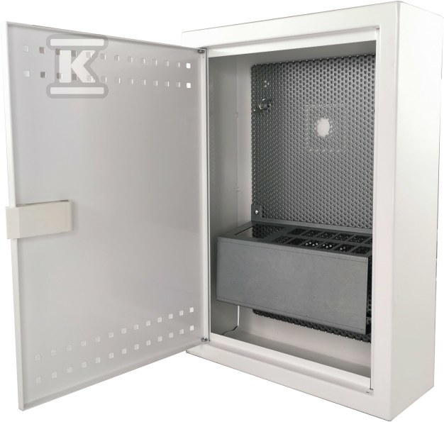Шафа з розмірами 350x250x90 мм, виготовлена з міцного оцинкованого листа, забезпечує тривалий захист для підключених кабелів та пристроїв. Перфоровані двері забезпечують вентиляцію, а одночасно обмежують доступ до внутрішнього простору. Застосування настінного монтажу полегшує встановлення та доступ до елементів всередині шафи.