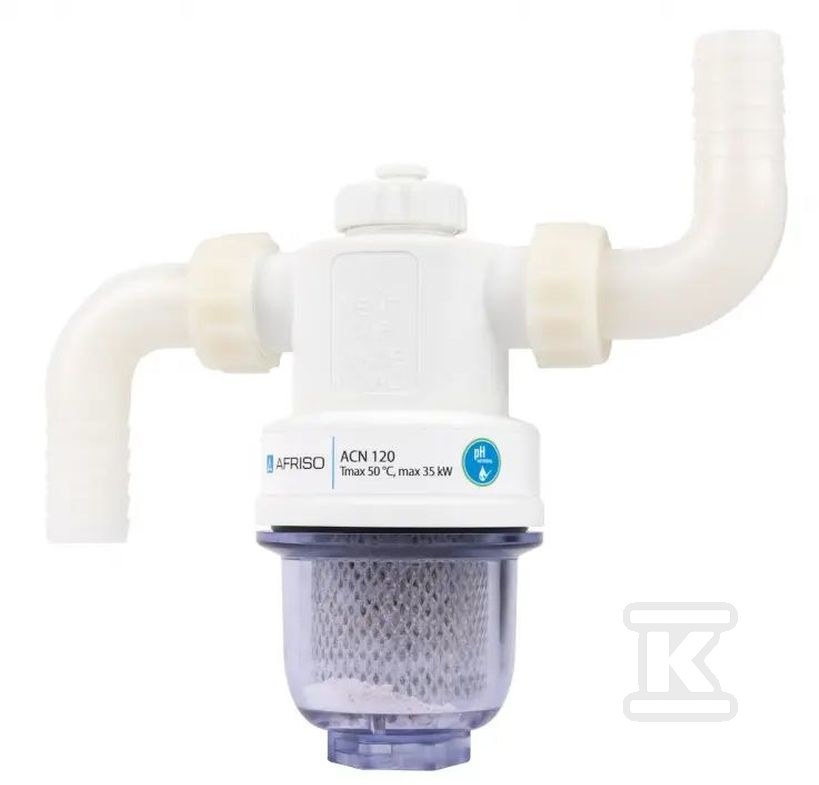ACN 120 вирізняється міцною конструкцією, заснованою на корпусі з міцного поліаміду PA66, армованого скловолокном. Прозорий відстійник дозволяє на постійній основі контролювати кількість нейтралізуючого заповнювача – карбонату кальцію (CaCO3) – та його евентуальне доповнення. Кутові з'єднання DN20 полегшують підключення до існуючої інсталяції.