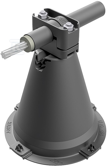 Ключовим елементом утримувача є міцна основа, виготовлена з поліпропілену. Цей матеріал характеризується високою стійкістю до морозу та УФ-випромінювання, що гарантує довготривалу надійність навіть в екстремальних погодних умовах. Заповнювач кронштейну – морозостійкий цементний розчин, що збільшує його міцність та стабільність. Металева частина утримувача виготовлена зі сталі, оцинкованої електролітично, що забезпечує захист від корозії. До комплекту входять два гвинти M6x30 також з оцинкованої сталі, які служать для кріплення провідника.
