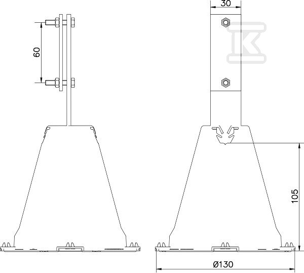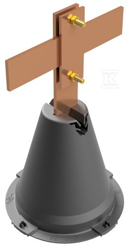 Опора виготовлена з міцних матеріалів – бетону, пластику та міді (або латуні в кріпильних елементах). Дозволяє будувати мережу струмопривідників, які ефективно відводять струм, викликаний ударом блискавки. Гвинти M6x20 з латуні забезпечують надійне з'єднання та стійкість до корозії. Тримач призначений для провідників діаметром до 50 мм, що робить його універсальним рішенням для різних установок.