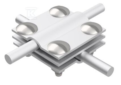 Це міцне хрестове з'єднання, призначене для з'єднання круглих і плоских проводів в системах блискавкозахисту та заземлення. Виготовлене з алюмінію, забезпечує міцне та надійне з'єднання, стійке до корозії та впливу атмосферних умов. Конструкція з чотирма отворами та трьома пластинами дозволяє підключити навіть кілька проводів одночасно, що збільшує гнучкість установки.