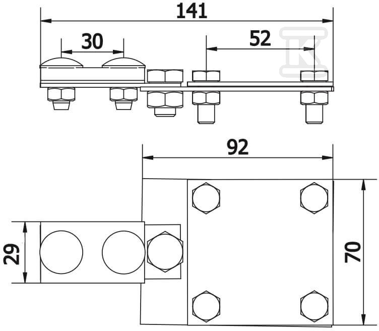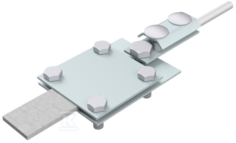 З'єднувальне клемне з'єднання розроблено з урахуванням довговічності та надійності. Виготовлене з високоякісної сталі, оцинкованої електролітично, забезпечує стійкість до корозії та тривалу дію атмосферних факторів. Призначене для проводів діаметром від 8 мм до 40 мм (тип B), що робить його універсальним рішенням для різних установок. Монтаж з'єднувального клемного з'єднання здійснюється за допомогою гвинтів M8 і M10 (4xM8x20, 1xM10x16, 2xM8x20), також оцинкованих, що гарантує сумісність і відсутність ризику гальванічної корозії.