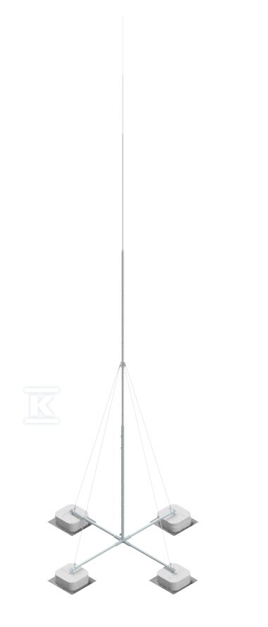 Мачт виготовлений з високоякісних матеріалів – оцинкованої сталі або алюмінію – що гарантує його довговічність та стійкість до корозії протягом багатьох років експлуатації. У комплекті також входять вісім бетонних обважнювачів, килимки та з'єднувач для проводу, забезпечуючи повноту системи. Використання морозостійких обважнювачів усуває необхідність склеювання до покрівельного покриття, що особливо важливо в районах, схильних до сильних вітрів – мачт відповідає вимогам вітрових зон I, II та III в Польщі.