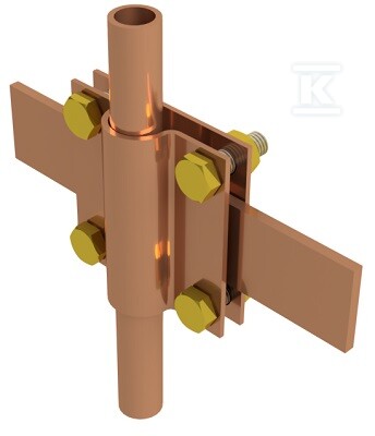 З'єднувач дозволяє з'єднувати стрижні діаметром 14-20 мм та плоскі провідники шириною до 40 мм. Виготовлений з міді високої чистоти (99,9%), гарантує відмінну електропровідність і стійкість до корозії. Монтажні гвинти з латуні забезпечують довговічність і надійність з'єднання. Служить для створення хрестових з'єднань, що дозволяє гнучко проектувати установки заземлення. Завдяки цьому він ідеальний як для нових установок, так і для модернізації існуючих систем блискавкозахисту.