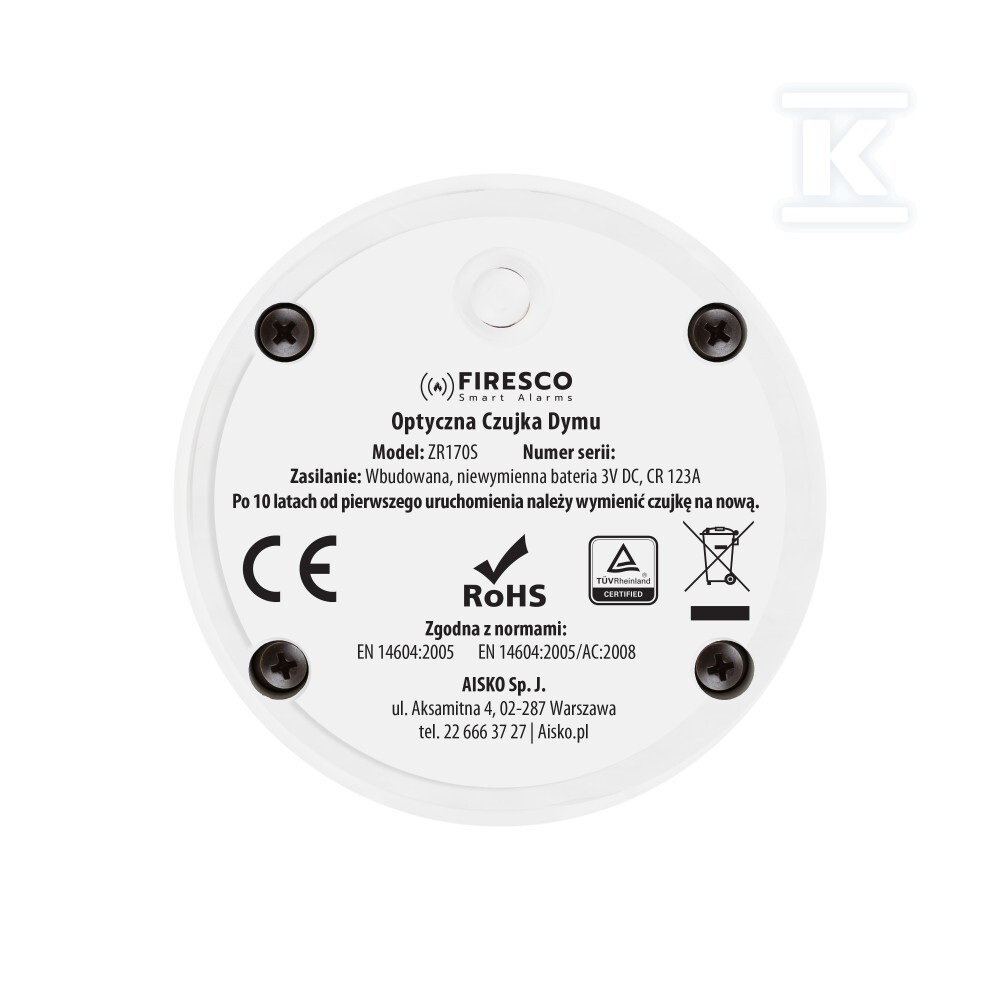Датчик Firesco ZR170S можна легко встановити на стелі або стіні. Виконаний з високоякісного пластику ABS з естетичною металевою захисною сіткою, він є міцним та стійким до пошкоджень. Пристрій відповідає вимогам польської норми PN-EN14604:2006 (EN14604:2005), що підтверджує його ефективність та безпеку – сертифікат TÜV Rheinland є додатковою гарантією якості. У комплекті ви знайдете все, що потрібно для монтажу: монтажний кронштейн, дюбелі та інструкцію з експлуатації польською мовою.