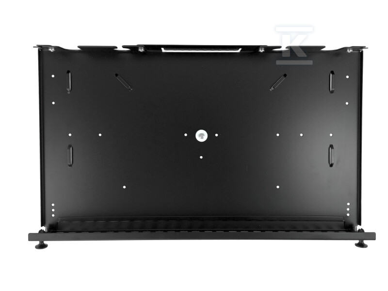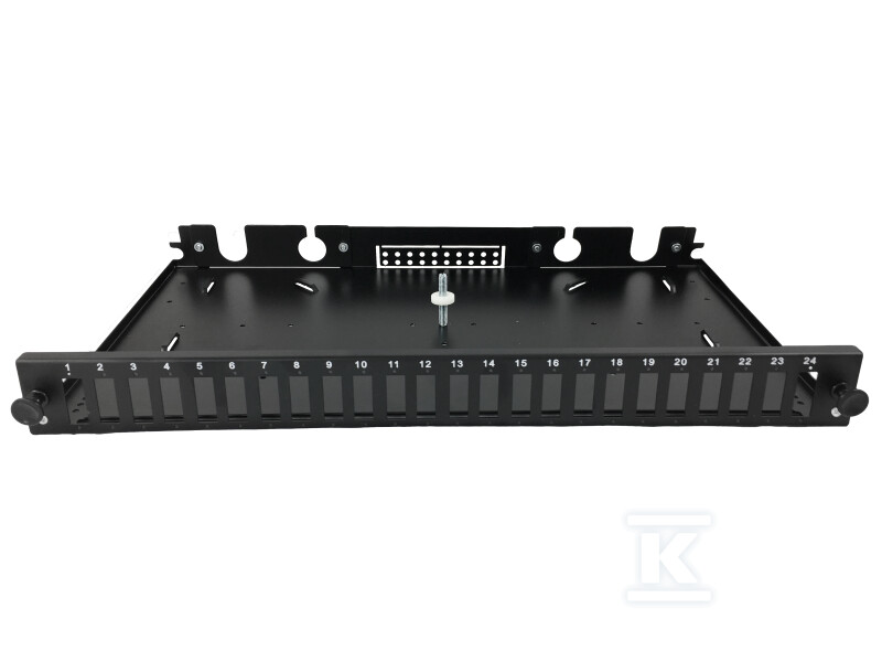 Волоконно-оптична панель з висувним лотком для монтажу в 19" шафах і стійках, 24 дуплексних порти SC, чорний. Висота 1U для монтажу в 19" стійку 24 порти, призначені для створення основних і проміжних точок розподілу оптоволокна. Роз'єми та обслуговування змінна передня панель із нумерацією портів для монтажних адаптерів у таких версіях: SC simplex, SC duplex, ST, FC, LC, E2000 стандартний колір RAL 7035 (сірий) та 9005 (чорний) п’ять отворів у задній частині регульовані монтажні вушка спеціальні ручки дозволяють кріплення 4 волоконно-оптичних касет (можливість демонтажу гвинта кріплення касети) сталевий корпус панелі з порошковим покриттям У комплект входять кріпильні елементи, сальники та кабельні стяжки з’єднання касет не входять