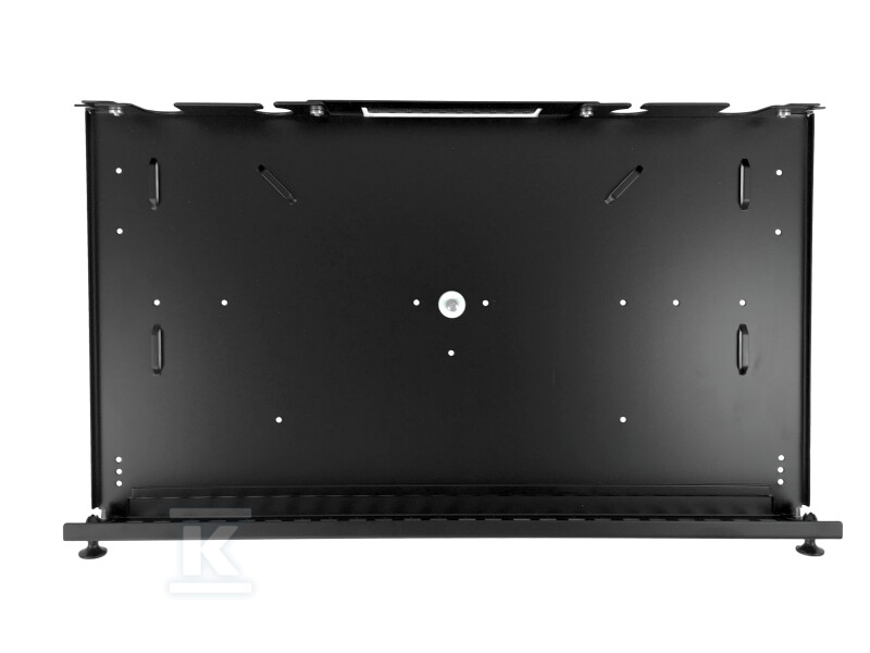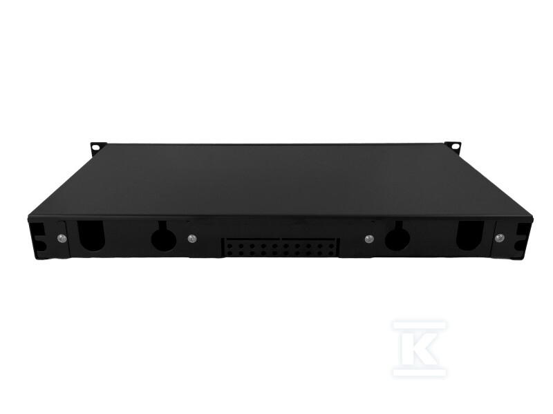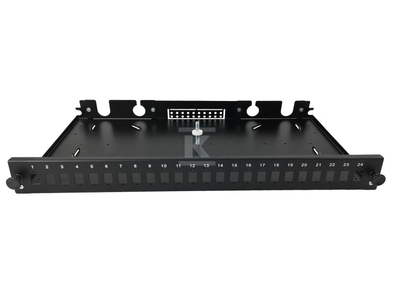 Оптоволоконна панель з висувним лотком для установки в 19" шафи і стійки, 24 SC симплексних порту, чорний колір. Висота 1U для монтажу в 19" стійку 24 порти призначені для створення основних і проміжних оптоволоконних розподільних точок. роз'єми і сервісна змінна передня панель з нумерацією портів для монтажних адаптерів у таких версіях: SC simplex, SC duplex, ST, FC, LC, E2000 стандартний колір RAL 7035 (сірий) і 9005 (чорний) п'ять отворів у задній частині регульовані монтажні вушка спеціальні ручки дозволяють приєднати 4 волоконно-оптичні касети (можливість демонтажу кріпильного гвинта касети) сталевий корпус панелі з порошковим покриттям У комплект входять кріпильні елементи, сальники та кабельні стяжки з’єднання касет не входять