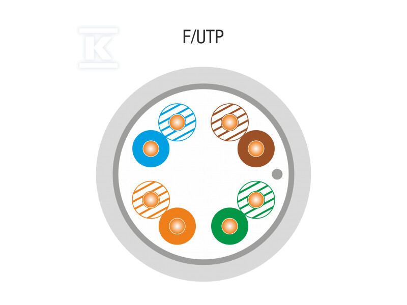 Кабель складається з чотирьох скручених пар мідних провідників перерізом 24 AWG, що гарантує хорошу провідність та мінімізує втрати сигналу. Серцевина кабелю екранована поліестеровою фольгою, що збільшує стійкість до електромагнітних перешкод (EMI). Завдяки цьому передача даних є більш стабільною, особливо в середовищах з високою інтенсивністю перешкод. Кабель відповідає вимогам категорії 5e, що дозволяє передавати дані зі швидкістю до 1 Гбіт/с при частоті 250 МГц – це більше, ніж стандартні 100 МГц для кабелів класу D. Виконаний з ПВХ, має клас Eca, що означає обмежену горючість та низьке виділення диму у разі пожежі.