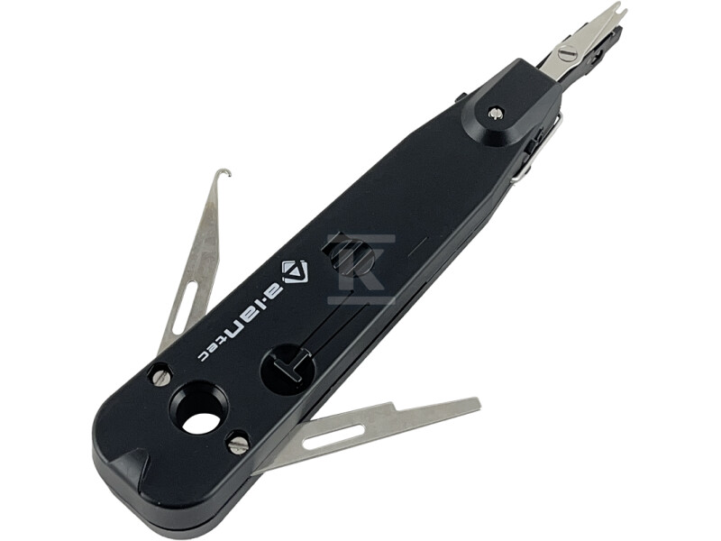 Призначений для окінцювання кабелів на роз'ємах LSA і колодках панелей телефонних з'єднань.Вбудовані ножиці з фіксатором для відрізання зайвого провідника, гачок для протягування дроту і елемент для вилучення роз'єму з розетки. Цей інструмент також має функцію викрутки.