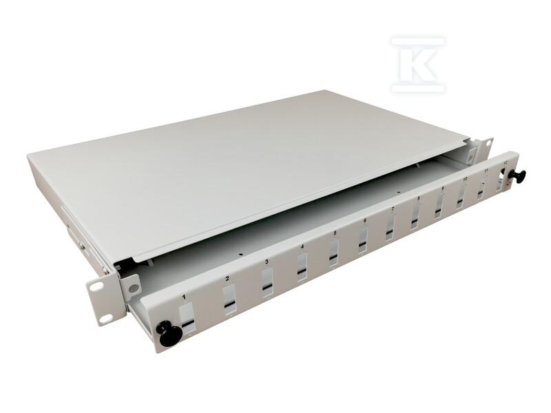 Оптоволоконна панель з висувним лотком для установки в 19" шафи і стійки, 12 SC дуплексних портів, сірий колір. Висота 1U для монтажу в 19" стійку 12 портів, призначені для створення основних і проміжних оптоволоконних розподільних точок. роз'єми і сервісна змінна передня панель з нумерацією портів для монтажних адаптерів у таких версіях: SC simplex, SC duplex, ST, FC, LC, E2000 стандартний колір RAL 7035 (сірий) і 9005 (чорний) п'ять отворів у задній частині регульовані монтажні вуха спеціальні ручки дозволяють кріпити 4 волоконно-оптичні касети (можливість демонтажу кріпильного гвинта касети), сталевий корпус панелі з порошковим покриттям, в комплект входять кріпильні елементи, сальники та кабельні стяжки, з’єднувальна касета не входить в комплектацію
