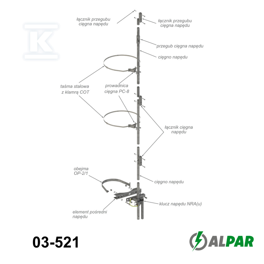 Привід NRA E-18 в.II є елементом, що служить для ручного керування повітряними з'єднувачами. Він уможливлює безпечне вмикання та вимикання електричних ланцюгів, що є ключовим під час робіт з технічного обслуговування, ремонту та при перемиканні живлення. Конструкція приводу була спроектована так, щоб забезпечити рівномірний розподіл сил і мінімізувати ризик механічних пошкоджень. Монтаж під лінією полегшує доступ і спрощує процес обслуговування. Привід кріпиться до з'єднувача за допомогою двох гвинтів M10 – стандартне рішення, що забезпечує стабільне з'єднання.