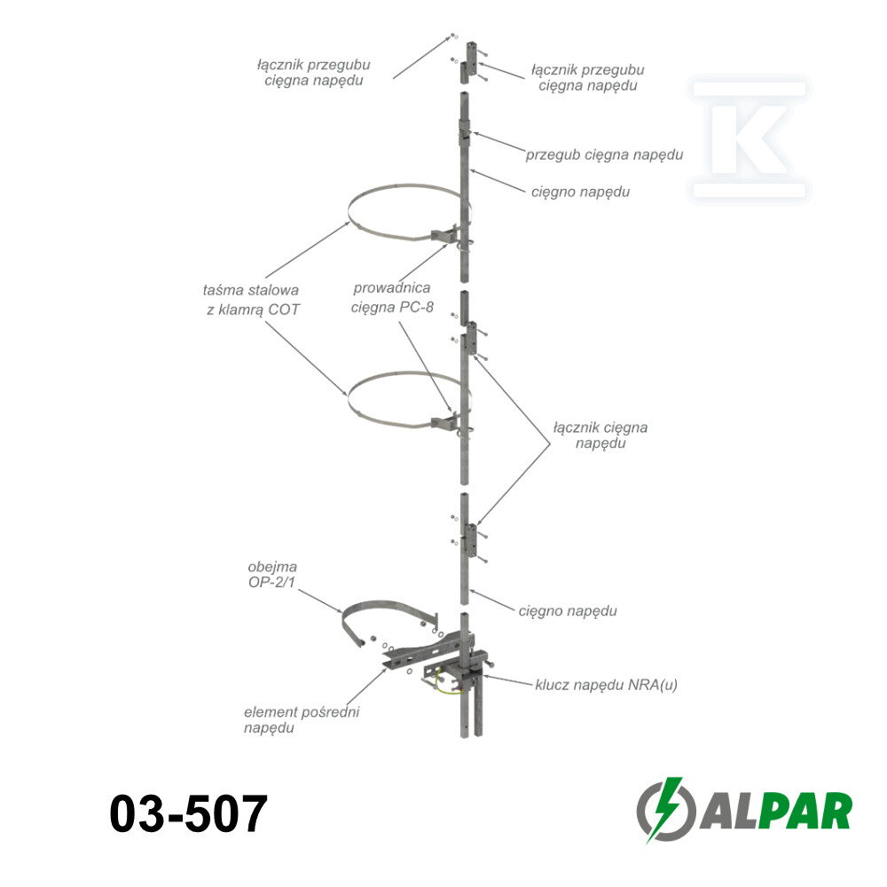 Цей ручний привід, позначений як NRA-u E-12 w.II (кат. номер 03-507), є ключовим елементом для безпечного та ефективного перемикання в повітряних лініях. Він служить для обслуговування з'єднувачів з заземленням, встановлених під лінією, забезпечуючи надійне керування електричними ланцюгами. Він особливо корисний там, де потрібно виконати кілька відгалужень від однієї опори, яка не має монтажних отворів.