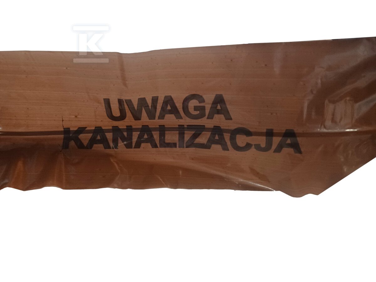 Стрічка має чіткий надпис „УВАГА КАНАЛІЗАЦІЯ”, який легко помітний і зрозумілий. Додатково, вбудована у стрічку вкладка зі сталі нержавіючої шириною 10 мм збільшує її механічну міцність та полегшує локалізацію за допомогою детекторів металу. Коричневий колір стрічки, що відповідає галузевим стандартам, допомагає у швидкій ідентифікації мережі каналізації під час земляних робіт.