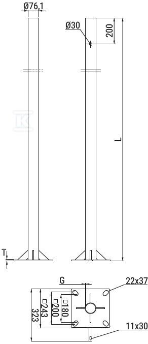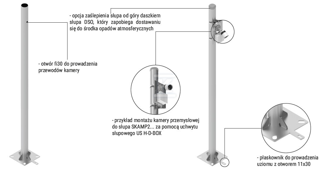 Продукт розроблено з урахуванням швидкого та безінвазивного кріплення пристроїв. У разі камер або прожекторів не потрібно свердлити трубу — достатньо використати спеціалізовані кронштейни (серії UKAM... або US...), які кріпляться безпосередньо до плоского фланця. Сама труба має спеціальний подовжній отвір розміром 11x30 мм, призначений для прокладання заземлювального проводу, що значно спрощує виконання вимог електробезпеки.
