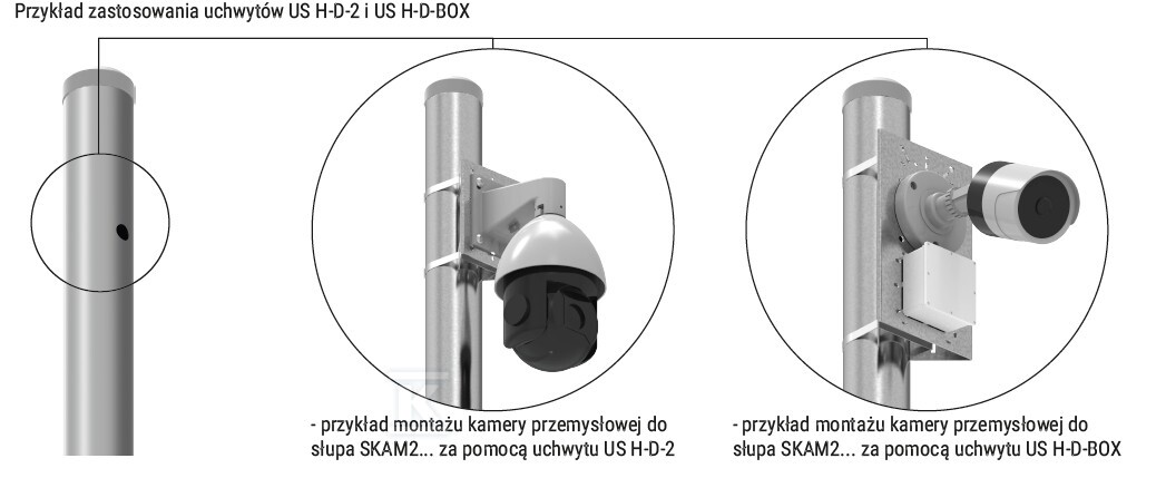 Основним призначенням кріплення US H-D-BOX є монтаж систем відеоспостереження на стовпах діаметром або стороною в діапазоні від 60 до 120 мм. Це типовий розмір для багатьох освітлювальних та огороджувальних стовпів, що зустрічаються в Україні. Варто пам'ятати, що якщо планується монтаж на стовпі з перерізом більшим за 120 мм, необхідно використати інший гвинтовий хомут з відповідним діапазоном регулювання — саме кріплення залишається тим самим, змінюється лише елемент кріплення до стовпа.