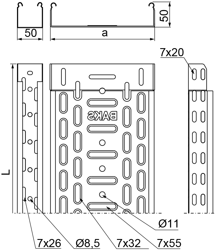 Кабельний маршрут S - оцинкована сталь Sendzimir PN-EN 10346: 2015-09 Індивідуальне замовлення: L - лакування в стандартній палітрі RAL - варіант F доступний для кабельних лотків KGL ... H50 шириною 50-200 мм. - система без муфт - з'єднання лотків вставлянням один в інший і згвинчуванням SGKM6x12 або SGM6x12 - глибокий отвір для тиснення, в нижній частині каналу від ширини 100 мм збільшує його міцність - щільна перфорація з ребрами забезпечує відмінну тепловіддачу і призначений для встановлення лотка на кронштейні BAKS в будь-якому місці - отвори 11 в нижній частині дозволяють підвішувати жолоби шириною 100 мм на стрижні з різьбленням - запропоновані замінники мають аналогічні параметри міцності - замовлення нижче 504 м буде реалізовано в більш тривалий термін - після узгодження