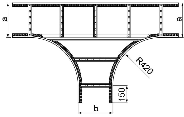 Розгалуження кабельної траси. Сталь, оцинкована методом Сендзиміра PN-EN 10346: 2015-09 За запитом: F - сталь, гаряче оцинкована PN-EN ISO 1461: 2011E - нержавіюча сталь PN-EN 10088L - фарбування в стандартний колір RAL Для монтажу використовуйте 6 кріплень, у комплекті LDC/LDOCH60i 24, включаючи болти SGKM8x14 або SGM8x14 Для нестандартних замовлень вказуйте розміри a і b.