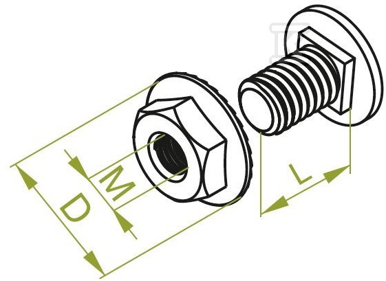 Гвинт з грибоподібною головкою в поєднанні з притискною гайкою утворює повну систему кріплення. Грибоподібна головка забезпечує естетичний вигляд та зручність монтажу, а притискна гайка з насічками збільшує стабільність з'єднання та запобігає самовільному відкручуванню. Застосування цього комплекту особливо помітне в системах кабельних трас, де точність і надійність кріплення є ключовими для безпеки та функціональності установки.