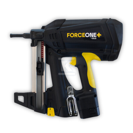 Затверджено ETA як повну систему: FORCE ONE+ + цвяхи XHA (мінімальна довжина, затверджена для сертифікації: 22 мм) + аксесуари CELO — що гарантує безпеку монтажу на твердих підґрунтях. У комплекті: два акумулятори, зарядний пристрій, кейс з оптимальним розподілом маси (можна ставити на риштування), захисні окуляри, беруші та інструмент для усунення заклинювань. Зворотний гачок дозволяє підвісити його на поясі або сходах — не потрібно класти на землю.