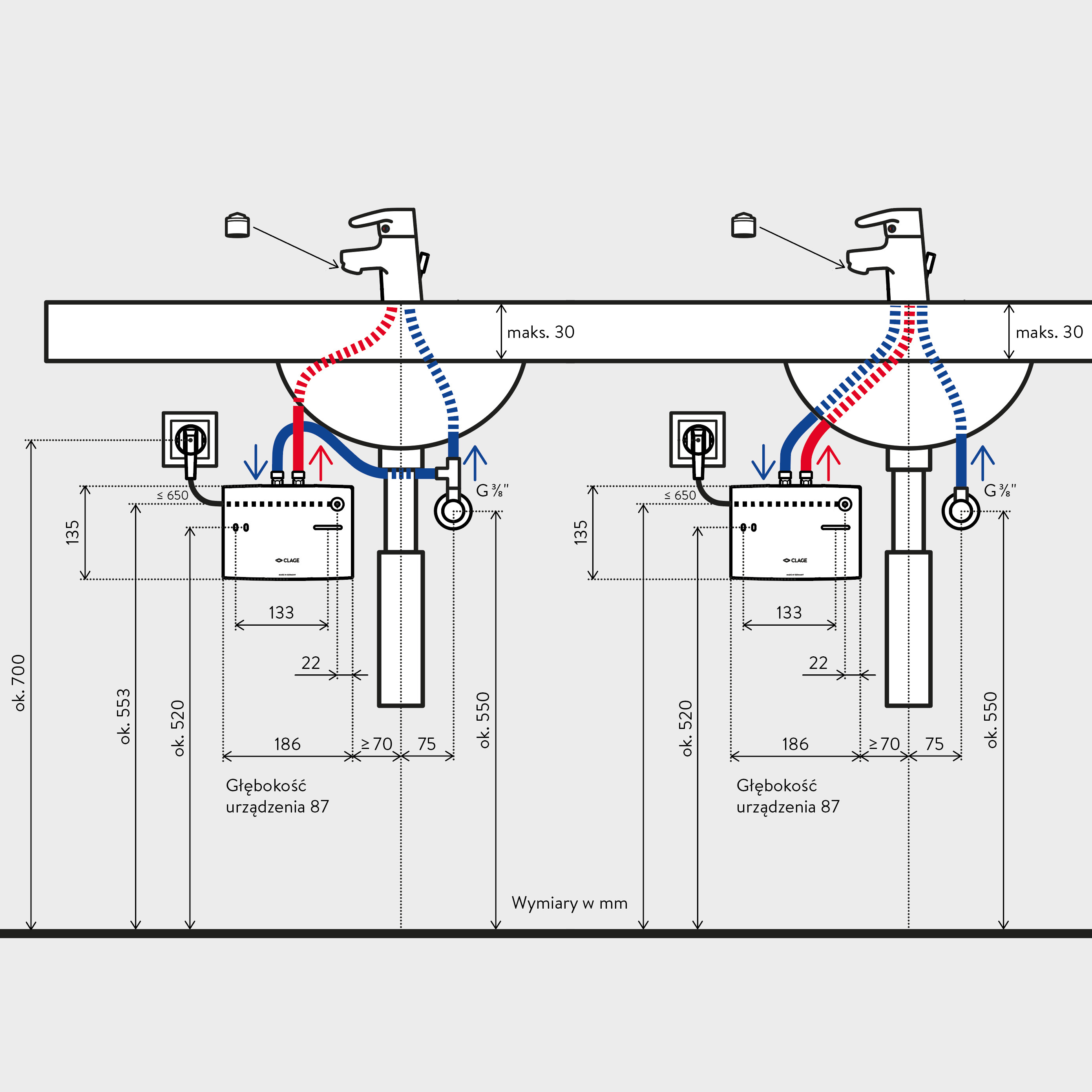 Монтаж простий: кріплення до стіни типу «вставлення» дозволяє приховати водонагрівач під раковиною без необхідності кріплення на гвинтах. Сітєвий кабель із вилкою Euro (довжина 65 см) та перетином проводу 1,5 мм² вже включений – достатньо підключити до захисту 15A.