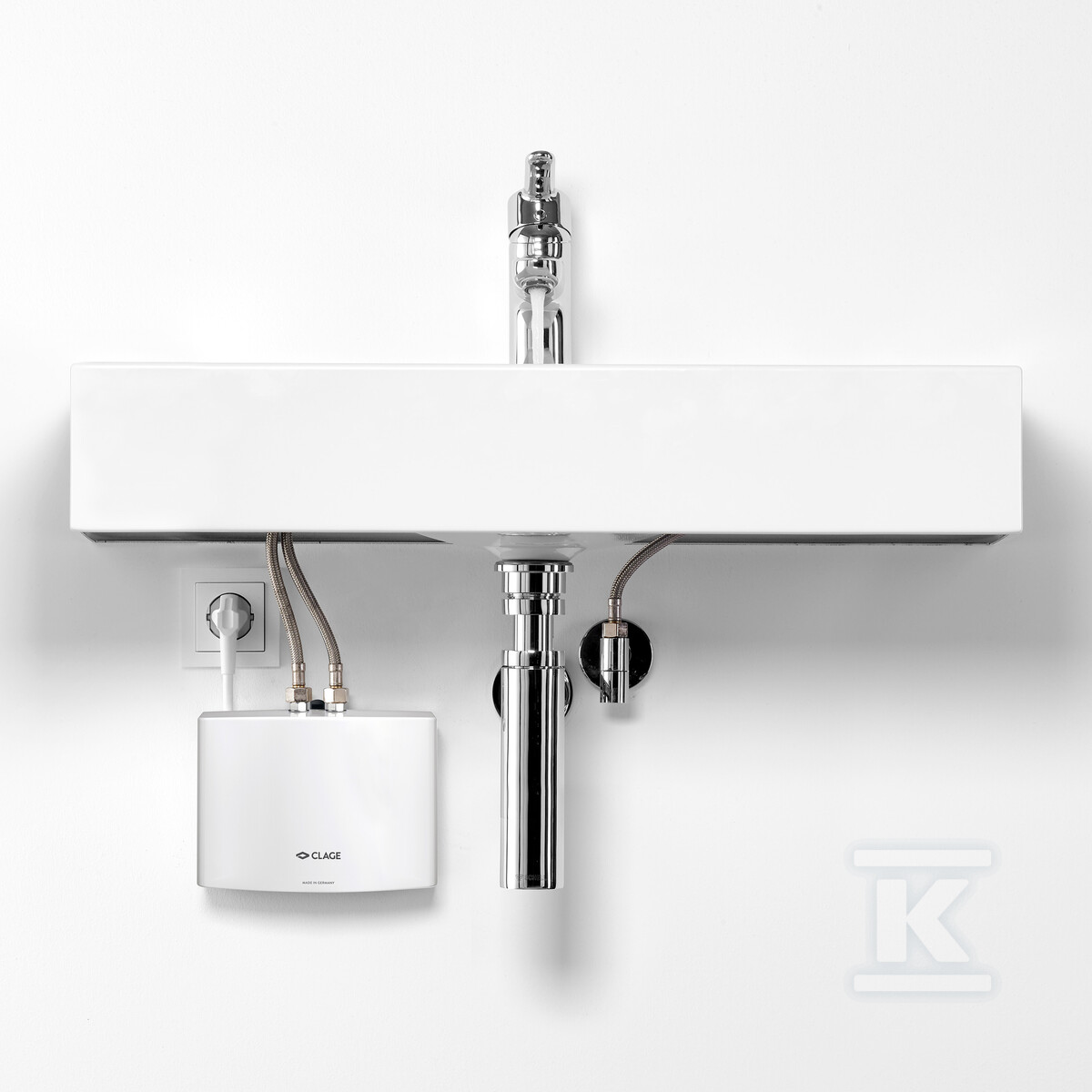 Пристрій працює лише тоді, коли тече вода – немає марного витрачання енергії, коли раковина не використовується. При витраті води понад 1,3 л/хв нагрівальний елемент потужністю 3,5 кВт автоматично вмикається і нагріває воду до температури 55°C, забезпечуючи продуктивність 2,0 л/хв при різниці температур 25 К. Цього достатньо для однієї раковини – не потрібно чекати на нагрівання бака, немає втрат тепла.