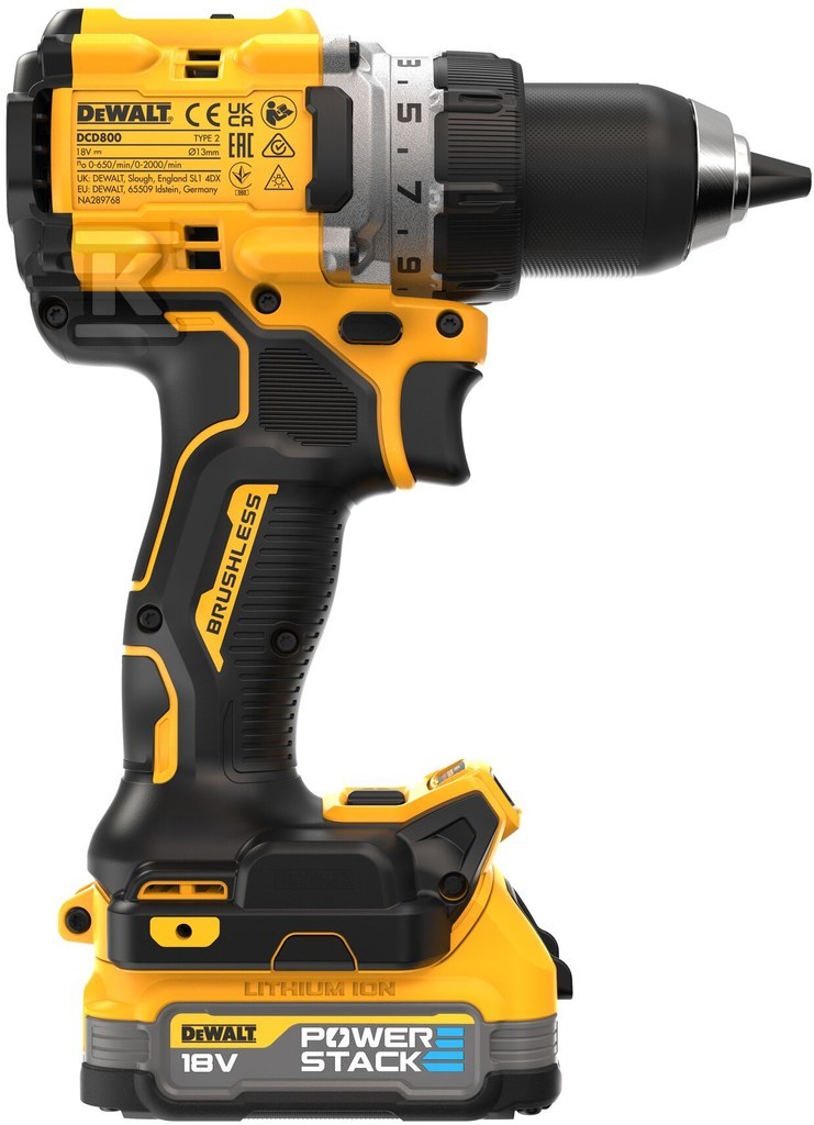 Дриль-шуруповерт DEWALT XR 18V безщітковий, 2-швидкісний, момент 90Nm, 2 акумулятори 1.7Ah POWERSTACK, зарядний пристрій та валіза TSTAK DCD800E2T-QW
