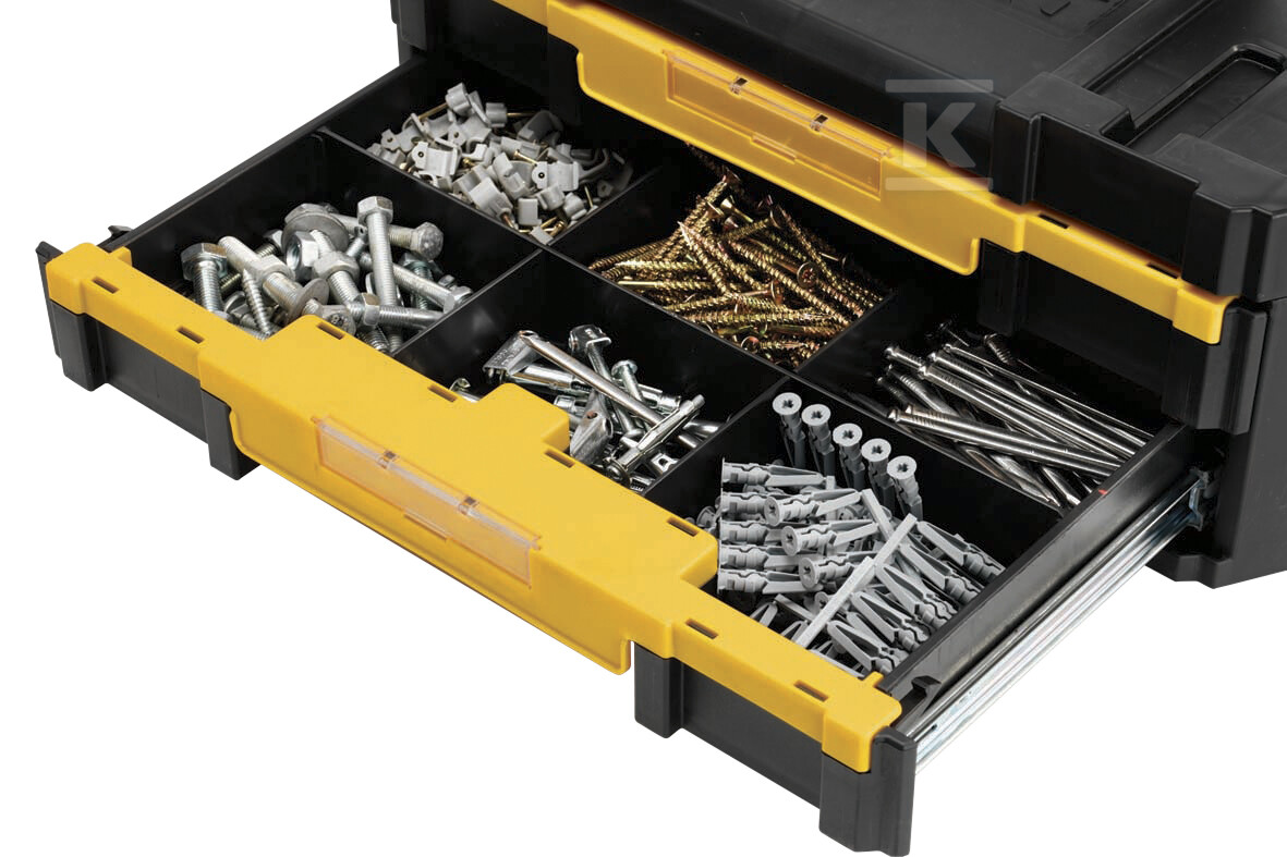 Скриня виготовлена з міцного пластику, що гарантує її стійкість до механічних пошкоджень та довготривале використання. Товщина стінок (2,8 – 3,0 мм) додатково збільшує її міцність. Дві шухляди, оснащені висувними перегородками, дозволяють точно організувати вміст – дрібні частини та аксесуари завжди будуть на своєму місці. Кулькові підшипники шухляд забезпечують плавне та надійне функціонування навіть при великому навантаженні (до 7,5 кг на шухляду). Двокомпонентна ручка полегшує перенесення скрині, а спеціальні зачіпки дозволяють стабільно з'єднувати її з іншими елементами системи TSTAK – створюючи узгоджений та функціональний набір.