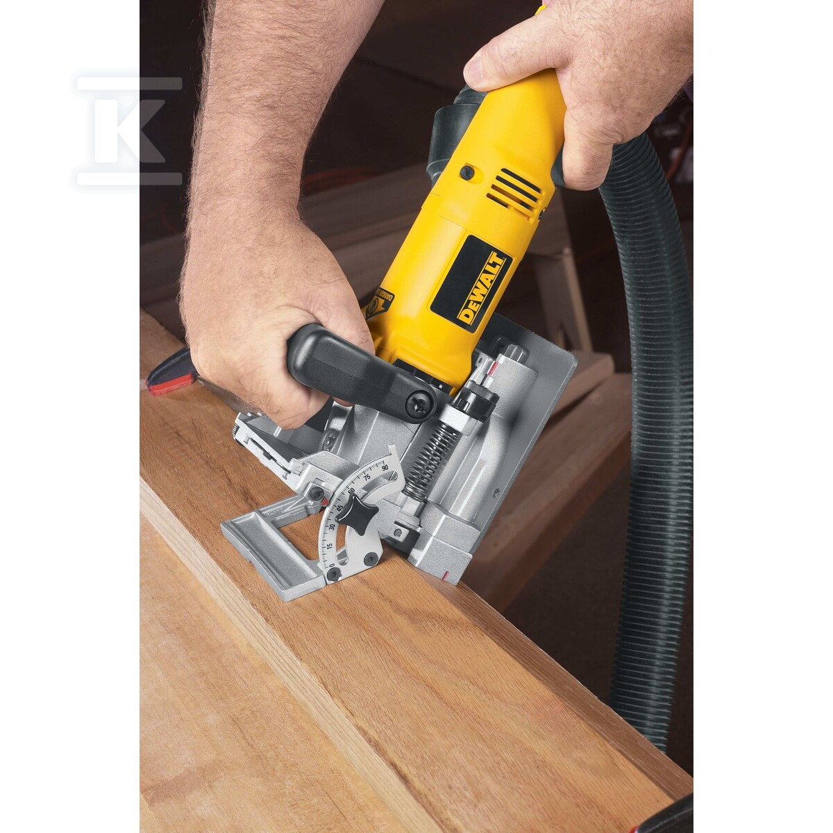 DW682K-QS вирізняється інтуїтивно зрозумілим керуванням і продуманою конструкцією. Зубчастий механізм забезпечує точне встановлення глибини фрезерування, а можливість регулювання кутової направляючої (0-90°) дозволяє адаптувати інструмент до різноманітних проектів. Встановлені глибини для штифтів 0, 10, 20 мм та опція прецизійного регулювання дають повний контроль над процесом з'єднання елементів. Нековзкий руків'я з вісьмома позначеними основними налаштуваннями та вікно в направляючій підвищують комфорт і точність роботи. Швидка заміна фрез завдяки блокуванню шпинделя – ще одна особливість, що полегшує роботу.