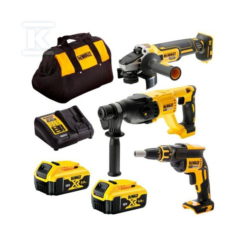 Комплект Combo 18V XR: перфоратор DCH133, кутова шліфувальна машина DCG405, шуруповерт для гіпсокартону DCF620, 2 акумулятори 5.0Ah, зарядний пристрій, сумка DCK304P2-QW