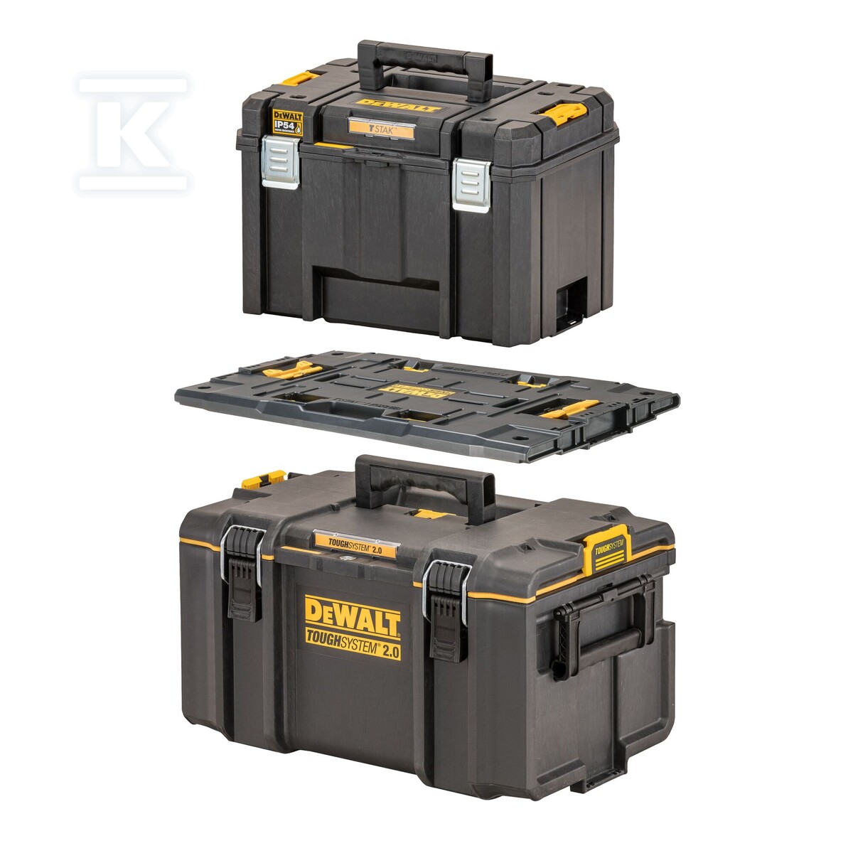 Цей набір поєднує в собі переваги двох популярних систем зберігання інструментів DeWALT – TSTAK та ToughSystem 2.0, пропонуючи комплексне рішення для професіоналів та вимогливих користувачів. Набір складається з глибокої скрині TSTAK VI, міцної скрині ToughSystem DS300 та адаптера, який дозволяє з'єднувати елементи обох систем. Це ідеальне рішення для тих, хто цінує модульність, довговічність та легкість транспортування інструментів.