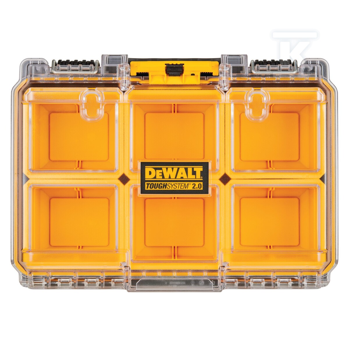 Органайзер DWST83392-1 характеризується міцною конструкцією з витривалого поліпропілену, стійкого до механічних пошкоджень. Він має ущільнення, що захищає вміст від вологи та пилу, що особливо важливо під час роботи у складних умовах. Прозора кришка дозволяє швидко ідентифікувати інструменти всередині без необхідності відкривання органайзера. Металеві защіпки спереду забезпечують надійне закриття, а водночас дозволяють легко відкривати однією рукою. Додатково, посилене металеве вушко для замка підвищує безпеку зберігання предметів.