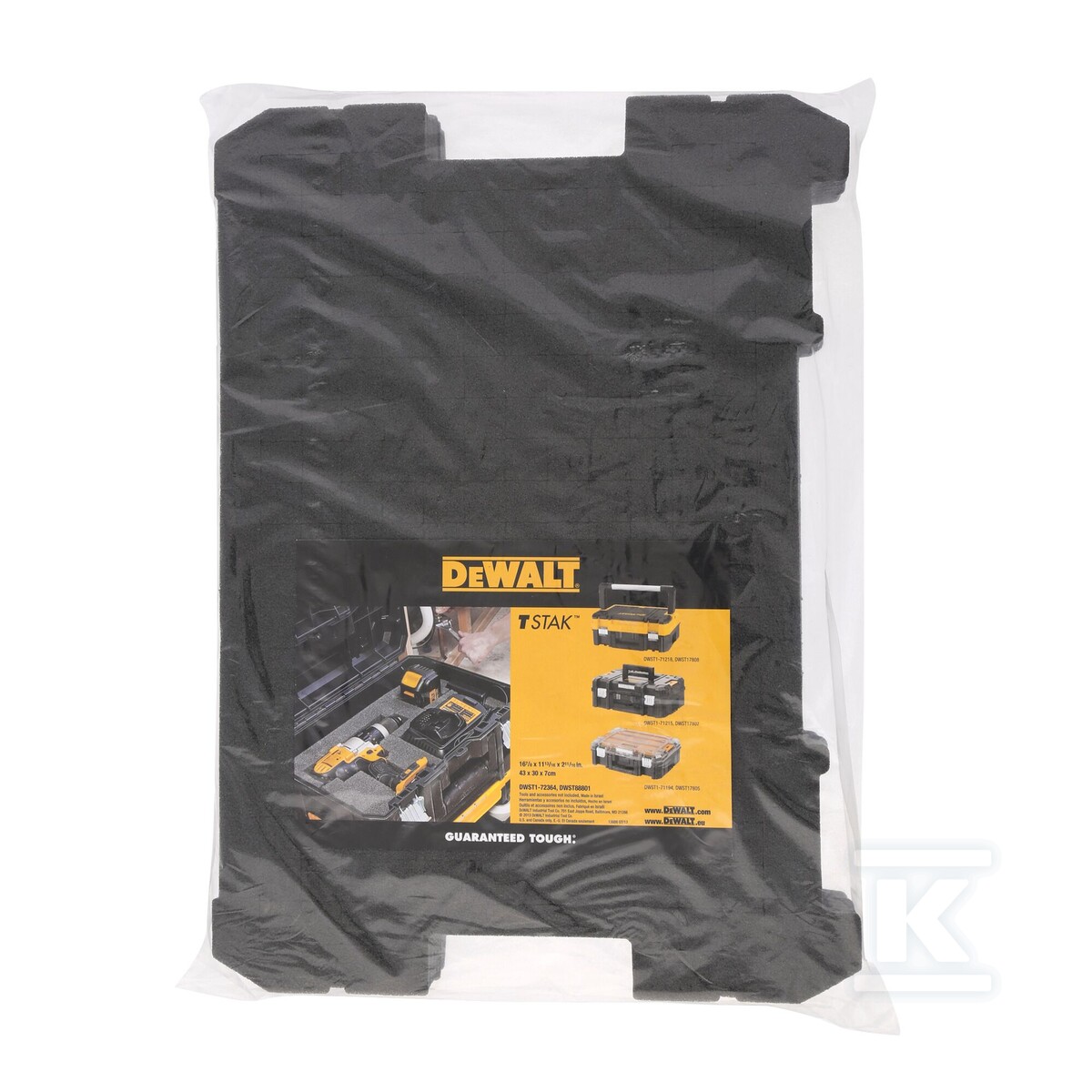Виготовлена з високоякісної піни, вкладка дозволяє легко вирізати форми, адаптовані до конкретних інструментів. Завдяки цьому кожен інструмент має своє визначене місце, що запобігає його переміщенню та пошкодженню під час транспортування. Модульна конструкція дозволяє адаптувати вкладку до різних конфігурацій інструментів, а також вона сумісна з популярними моделями ящиків TSTAK – DWST17808, DWST17807 та DWST17805.
