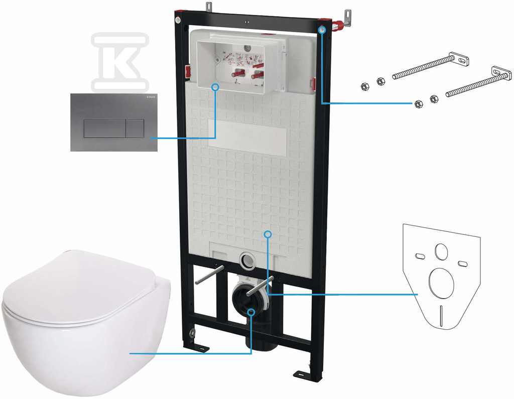 До складу комплекту входить все, що вам потрібно для створення повноцінної підвісної системи: каркас, безобідковий унітаз, плавно закриваюча кришка, кнопка змиву, амортизуючий килимок та монтажні гвинти. Завдяки цьому ви уникнете проблем з сумісністю окремих елементів і заощадите час під час встановлення. Чаша розроблена без обідка, що значно полегшує підтримку гігієни – відсутність закутків означає менше місця для бактерій і забруднень. Крім того, кришка з функцією плавного закриття запобігає гучному стуку та пошкодженню кераміки.