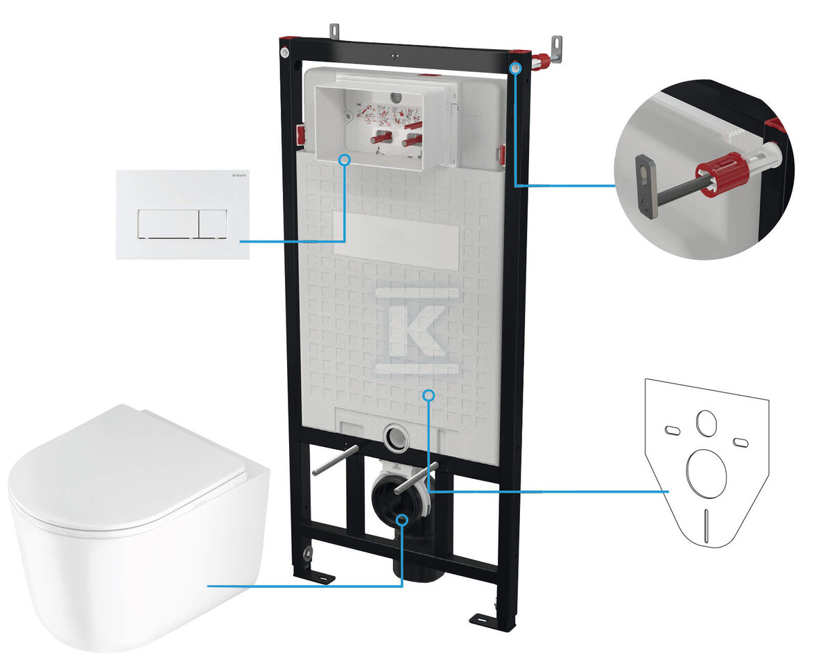 Серцем набору є стабільний підвісний каркас з регулюванням висоти (до 200 мм), який забезпечує надійність та довговічність конструкції. Бачок об’ємом 9 літрів пропонує можливість подвійного змиву (3/6 л), дозволяючи заощаджувати воду. Тихий механізм змиву та наповнення бачка – це гарантія комфорту користування. Каркас пристосований як для монтажу в стінах з гіпсокартону, так і в несучих стінах. З’єднувальний клапан G1/2'' полегшує підключення до водопровідної системи.