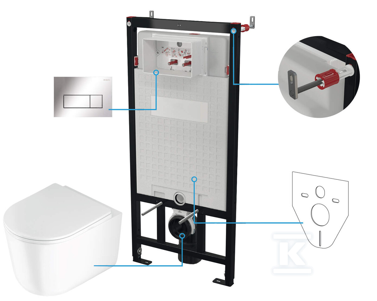 Каркас пристосований як для легкої обшивки, так і для установки перед несучою стіною, що дає велику свободу в плануванні. Тихий механізм змиву та наповнення бачка забезпечує комфорт у використанні, усуваючи неприємні звуки. Відстань між монтажними отворами (180 мм і 230 мм) гарантує сумісність з більшістю унітазів, доступних на ринку.