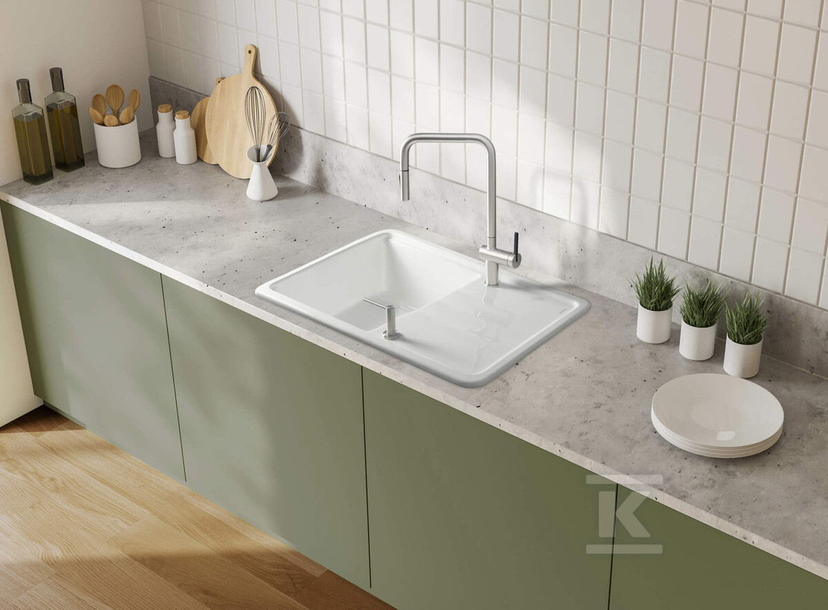 Зворотна конструкція дозволяє монтувати її камерою зліва або справа, адаптуючи її до вашого планування кухні. Маскувальна кришка зливу, виготовлена з кераміки, ідеально поєднується з цілісним та елегантним виглядом. Мийка оснащена двома готовими отворами, що полегшує монтаж змішувача та дозатора для миючих засобів. Кераміка, як матеріал виготовлення, характеризується високою стійкістю кольору та стійкістю до дії хімічних речовин та запахів – це інвестиція на роки.